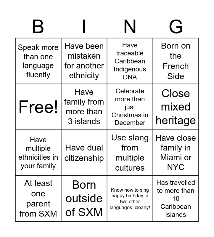 This bingo card has 16 words: Born outside of SXM, Have close family in Miami or NYC, Have traceable Caribbean Indigenous DNA, Speak more than one language fluently, Have multiple ethnicities in your family, Have been mistaken for another ethnicity, Use slang from multiple cultures, Know how to sing happy birthday in two other languages..clearly!, Free!, Have family from more than 3 islands, At least one parent from SXM, Born on the French Side, Have dual citizenship, Close mixed heritage, Celebrate more than just Christmas in December and Has travelled to more than 10 Caribbean islands.