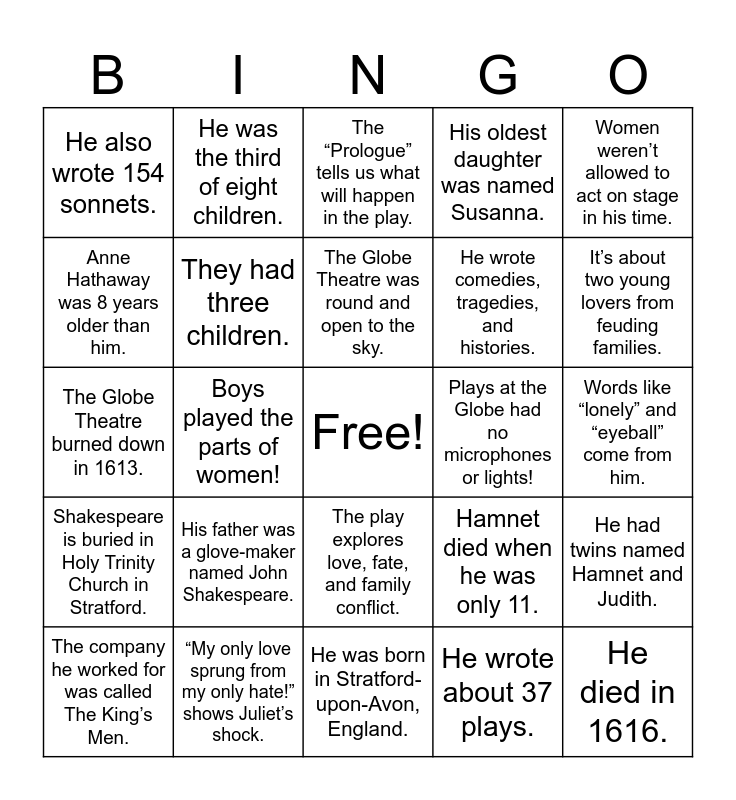 This bingo card has a free space and 50 words: Shakespeare was born in 1564., He died in 1616., He lived over 400 years ago!, He was born in Stratford-upon-Avon, England., His father was a glove-maker named John Shakespeare., His mother’s name was Mary Arden., He was the third of eight children., He married Anne Hathaway., Anne Hathaway was 8 years older than him., He married her when he was 18., They had three children., His oldest daughter was named Susanna., He had twins named Hamnet and Judith., Hamnet died when he was only 11., Shakespeare moved to London to become a playwright., He helped build the Globe Theatre., The Globe Theatre was round and open to the sky., Plays at the Globe had no microphones or lights!, People called the cheapest audience members “groundlings.”, Women weren’t allowed to act on stage in his time., Boys played the parts of women!, He wrote about 37 plays., He also wrote 154 sonnets., He wrote comedies, tragedies, and histories., Romeo and Juliet is one of his most famous plays., The story takes place in Verona, Italy., It’s about two young lovers from feuding families., The opening scene includes a street fight!, The “Prologue” tells us what will happen in the play., The play explores love, fate, and family conflict., One theme is how hatred destroys love., Another theme is how young people challenge tradition., “Two households, both alike in dignity…” begins the play., “A pair of star-crossed lovers take their life” comes next., “My only love sprung from my only hate!” shows Juliet’s shock., “What’s in a name? That which we call a rose…” is about identity., “Good night, good night! Parting is such sweet sorrow.”, “O Romeo, Romeo! Wherefore art thou Romeo?” means “Why are you Romeo?”, Shakespeare invented over 1,700 English words!, Words like “lonely” and “eyeball” come from him., He often used iambic pentameter, a rhythmic pattern., He wrote for both commoners and royalty., Queen Elizabeth I loved his plays., Later, King James I became his patron., The company he worked for was called The King’s Men., The Globe Theatre burned down in 1613., It was rebuilt later near the same spot., His plays were first collected in a book called the First Folio., Shakespeare is buried in Holy Trinity Church in Stratford. and His tombstone has a curse warning people not to move his bones!.