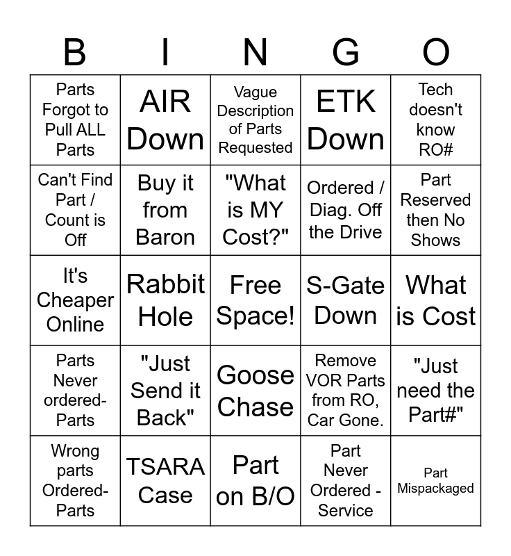 This bingo card has a free space and 29 words: Wrong parts Ordered-Parts, Profuse use of Profanity, Rabbit Hole, Extended Warranty Ships Own Parts, Parts Forgot to Pull ALL Parts, Vague Description of Parts Requested, Buy it from Baron, "Just Send it Back", S-Gate Down, TSARA Case, What is Cost, Part Mispackaged, Part on B/O, Part Never Ordered - Service, Part Reserved then No Shows, "Make sure Parts are @ Cost", Goose Chase, Parts Never ordered-Parts, Tech doesn't know RO#, It's Cheaper Online, Remove VOR Parts from RO, Car Gone., Part is Shorted, Ordered / Diag. Off the Drive, Can't Find Part / Count is Off, ETK Down, AIR Down, "Just need the Part#", "What is MY Cost?" and IDS Case.