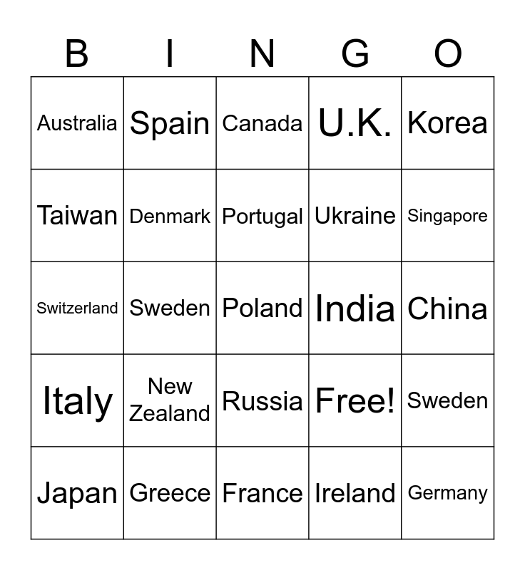 This bingo card has 25 words: New Zealand, France, Portugal, Japan, Korea, Australia, Taiwan, Spain, India, Russia, Ukraine, Switzerland, Free!, Sweden, Denmark, Germany, China, Canada, Singapore, Sweden, Poland, Greece, Italy, U.K. and Ireland.