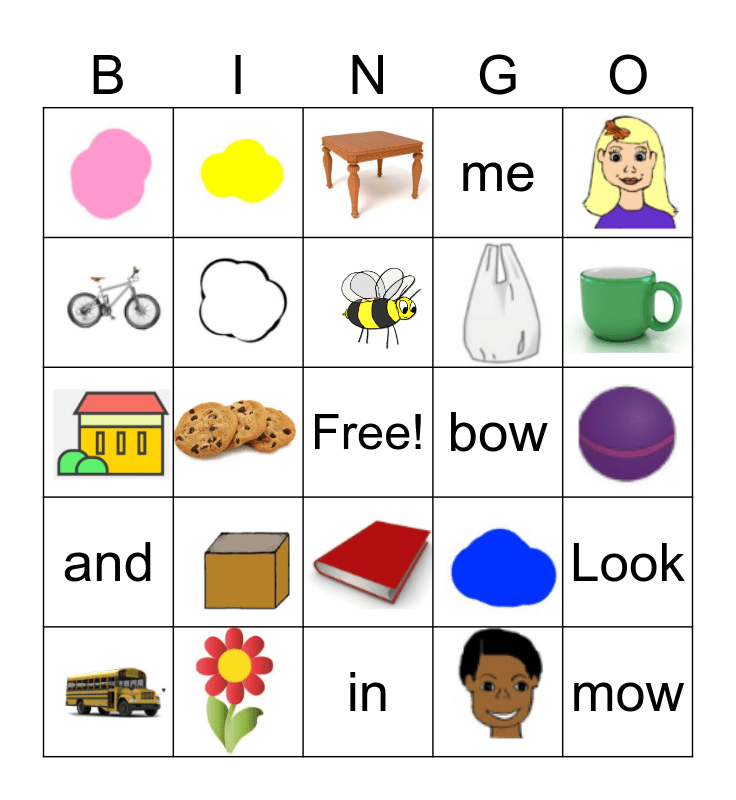 This bingo card has 18 images, a free space and 6 words: bow, Look, mow, and, me and in.