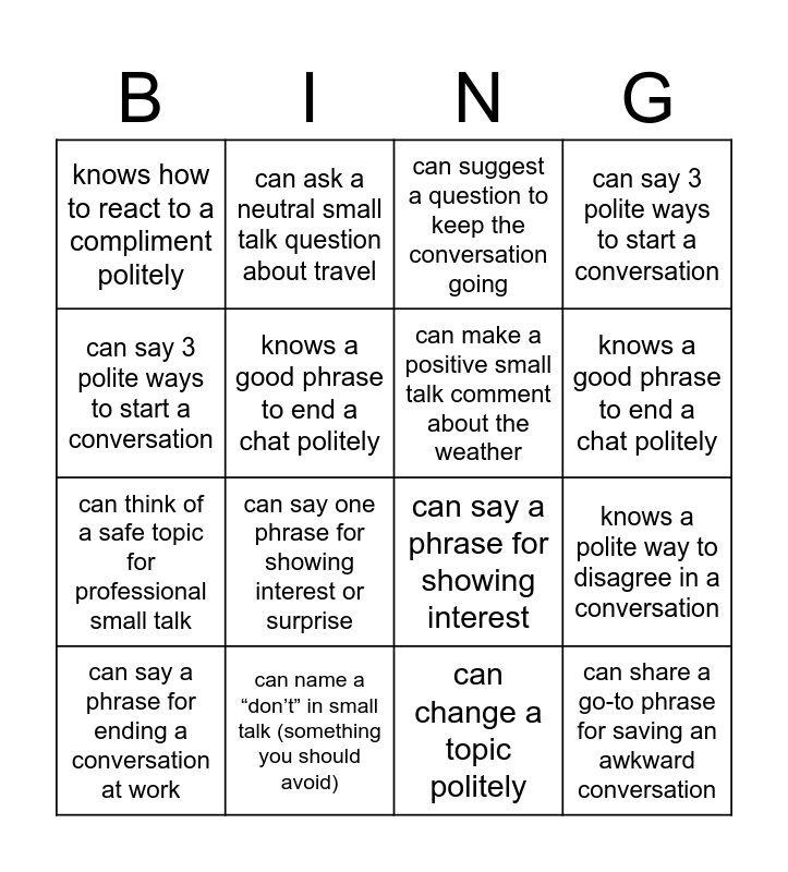⚠ This card has duplicate items: can say 3 polite ways to start a conversation (2), can say one phrase for showing interest or surprise (2), knows a good phrase to end a chat politely (2)