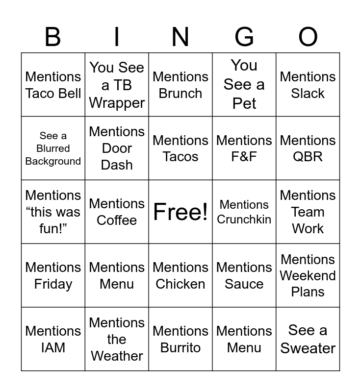 This bingo card has a free space and 24 words: Mentions IAM, Mentions Menu, Mentions Tacos, Mentions Menu, Mentions Slack, Mentions Taco Bell, You See a TB Wrapper, Mentions Brunch, Mentions Crunchkin, Mentions Team Work, Mentions “this was fun!”, Mentions Door Dash, Mentions Sauce, Mentions Weekend Plans, See a Blurred Background, Mentions the Weather, Mentions Burrito, You See a Pet, Mentions QBR, Mentions Friday, Mentions Coffee, Mentions Chicken, Mentions F&F and See a Sweater.