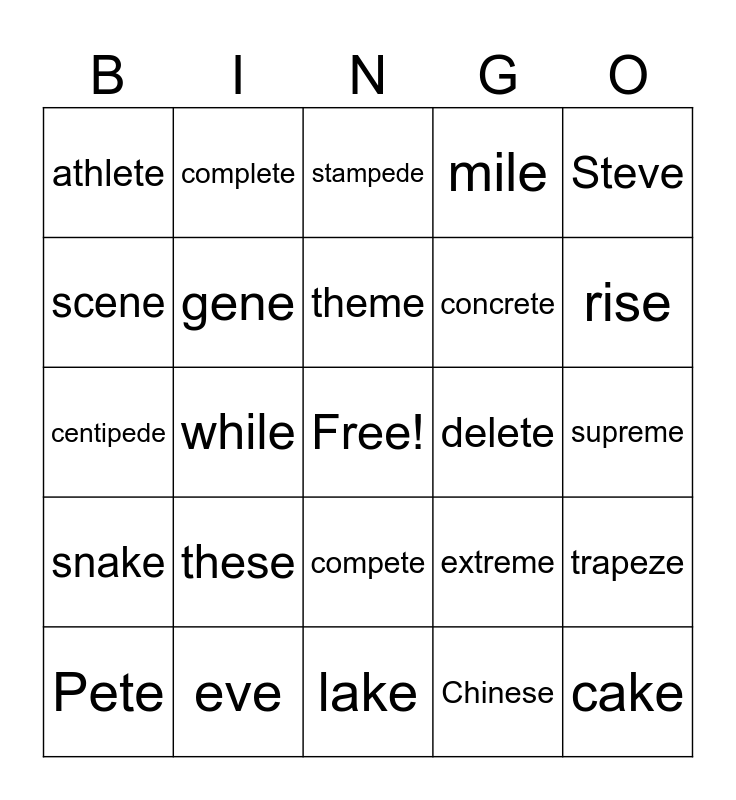 This bingo card has a free space and 24 words: these, eve, theme, Pete, Steve, athlete, scene, complete, delete, compete, concrete, centipede, extreme, trapeze, gene, Chinese, supreme, stampede, rise, while, cake, snake, mile and lake.