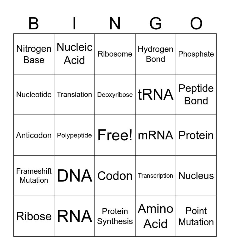 This bingo card has a free space and 24 words: DNA, RNA, Deoxyribose, Ribose, Phosphate, Nitrogen Base, Nucleotide, Nucleic Acid, mRNA, Codon, tRNA, Anticodon, Transcription, Nucleus, Translation, Amino Acid, Protein, Ribosome, Peptide Bond, Polypeptide, Point Mutation, Frameshift Mutation, Hydrogen Bond and Protein Synthesis.