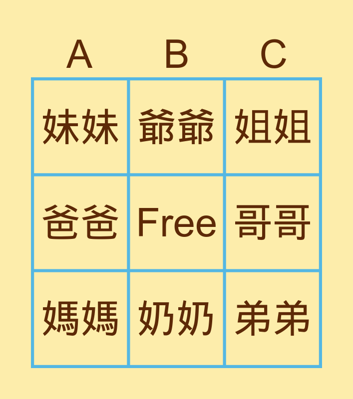 This bingo card has a free space and 8 words: 爸爸, 爺爺, 哥哥, 媽媽, 姐姐, 妹妹, 奶奶 and 弟弟.