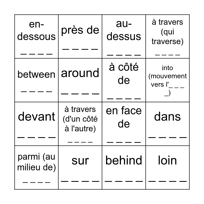 This bingo card has 16 words: sur _ _ _ _, dans _ _ _ _, au-dessus _ _ _ _, en-dessous _ _ _ _, devant _ _ _ _, près de _ _ _ _, en face de _ _ _ _, behind _ _ _ _, between _ _ _ _, around _ _ _ _, parmi (au milieu de) _ _ _ _, à travers (qui traverse) _ _ _ _, à travers (d'un côté à l'autre) _ _ _ _, into (mouvement vers l'_ _ _ _), à côté de _ _ _ _ and loin _ _ _ _.