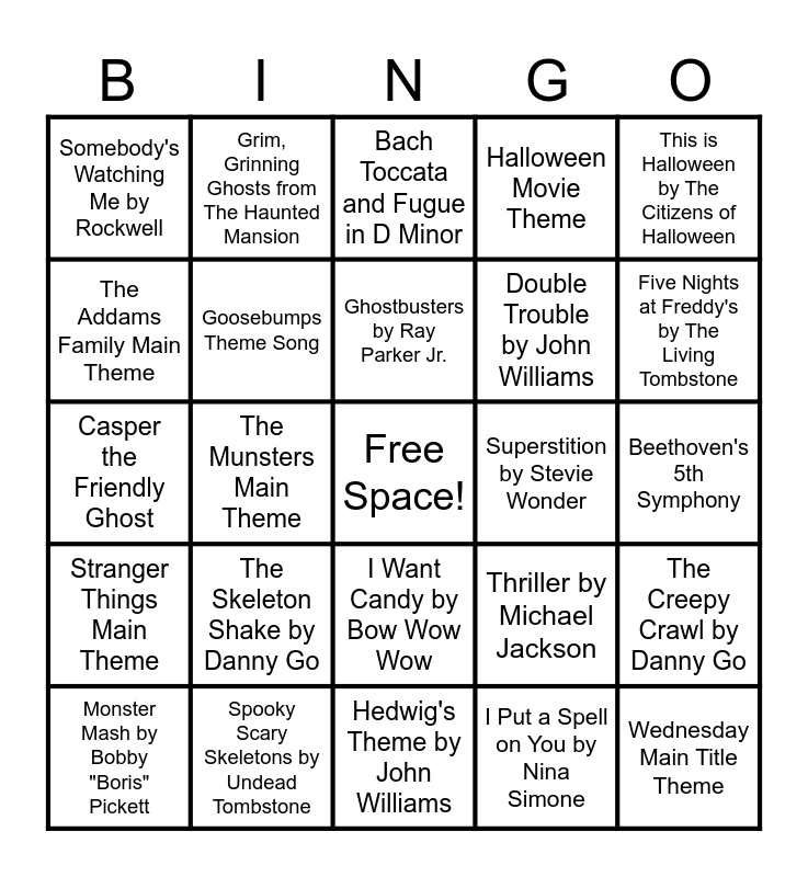 This bingo card has a free space and 24 words: The Skeleton Shake by Danny Go, Spooky Scary Skeletons by Undead Tombstone, Ghostbusters by Ray Parker Jr., Monster Mash by Bobby "Boris" Pickett, This is Halloween by The Citizens of Halloween, Somebody's Watching Me by Rockwell, The Addams Family Main Theme, Grim, Grinning Ghosts from The Haunted Mansion, Superstition by Stevie Wonder, I Want Candy by Bow Wow Wow, Double Trouble by John Williams, Casper the Friendly Ghost, Thriller by Michael Jackson, The Creepy Crawl by Danny Go, Goosebumps Theme Song, I Put a Spell on You by Nina Simone, Beethoven's 5th Symphony, Bach Toccata and Fugue in D Minor, Five Nights at Freddy's by The Living Tombstone, The Munsters Main Theme, Wednesday Main Title Theme, Stranger Things Main Theme, Halloween Movie Theme and Hedwig's Theme by John Williams.
