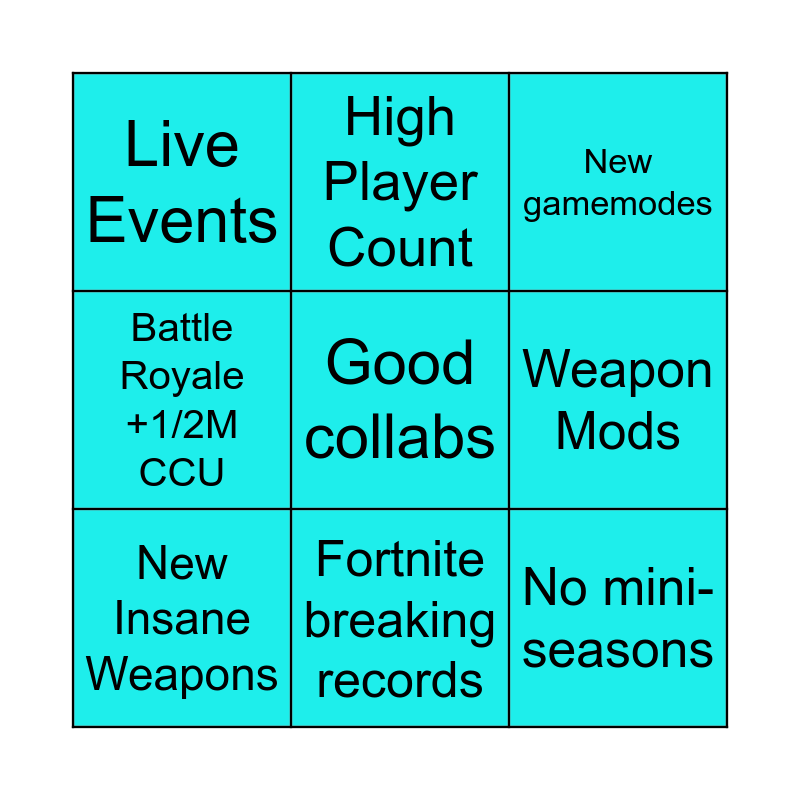This bingo card has a free space and 8 words: Weapon Mods, New gamemodes, High Player Count, New Insane Weapons, Live Events, No mini-seasons, Battle Royale +1/2M CCU and Fortnite breaking records.