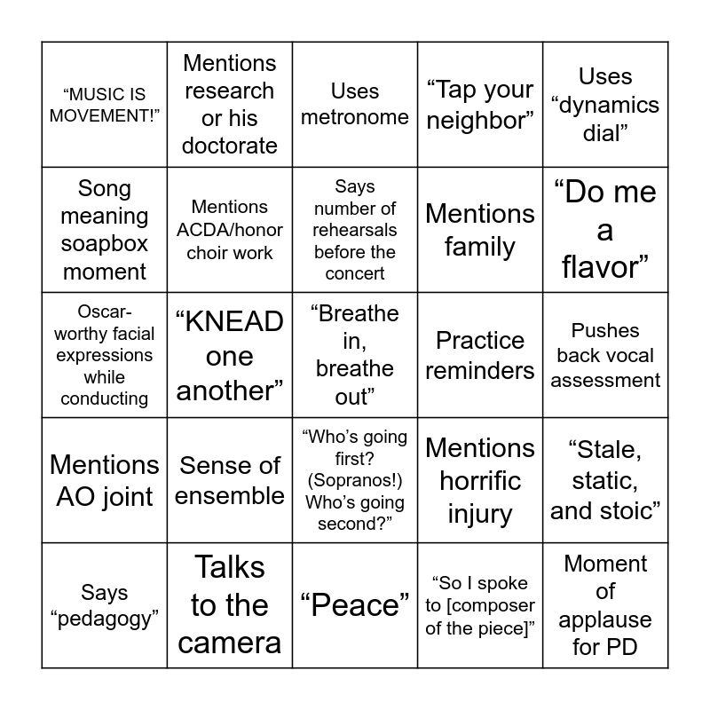 This bingo card has a free space and 24 words: Sense of ensemble, Talks to the camera, Says number of rehearsals before the concert, Says “pedagogy”, Uses “dynamics dial”, “MUSIC IS MOVEMENT!”, Song meaning soapbox moment, Mentions research or his doctorate, Practice reminders, “Who’s going first? (Sopranos!) Who’s going second?”, Mentions family, Oscar-worthy facial expressions while conducting, Mentions horrific injury, “Stale, static, and stoic”, Mentions ACDA/honor choir work, “So I spoke to [composer of the piece]”, Pushes back vocal assessment, Uses metronome, “Do me a flavor”, “KNEAD one another”, Moment of applause for PD, Mentions AO joint, “Tap your neighbor” and “Peace”.