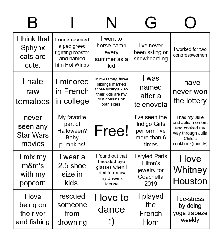 This bingo card has a free space and 36 words: I have watched the entire "the office" series too many times to count, I saw Michael Jordan play basketball at the Pit., I have 6 dogs., I minored in French in college, I styled Paris Hilton's jewelry for Coachella 2019, I mix my m&m's with my popcorn, In my family, three siblings married three siblings - so their kids are my first cousins on both sides., I love Whitney Houston., I worked for two congresswomen, I have 2 dogs, 2 cats, and a snake, My favorite part of Halloween? Baby pumpkins!, I've never been skiing or snowboarding, I have lived in two states that start with the word New., I've seen the Indigo Girls perform live more than 6 times, I have never won the lottery, I think that Sphynx cats are cute., I make excellent pasta., I wear a 2.5 shoe size in kids., I de-stress by doing yoga trapeze weekly, I went to horse camp every summer as a kid, I had my Julie and Julia moment and cooked my way through Julia Child's cookbook(mostly), I love Whitney Houston, rescued someone from drowning, I love being on the river and fishing, I love to dance :), I once rescued a pedigreed fighting rooster and named him Hot Wings, never seen any Star Wars movies, I've spent an embarassing amount on Taco Bell this year, I was named after a telenovela, I hate raw tomatoes, I have a very useful version of photographic memory / visual recall, For the first half of my life, I did not like dogs., I played the French Horn, I found out that I needed eye glasses when I tried to renew my driver's license, I was a bounty hunter for two years and I met Oprah..