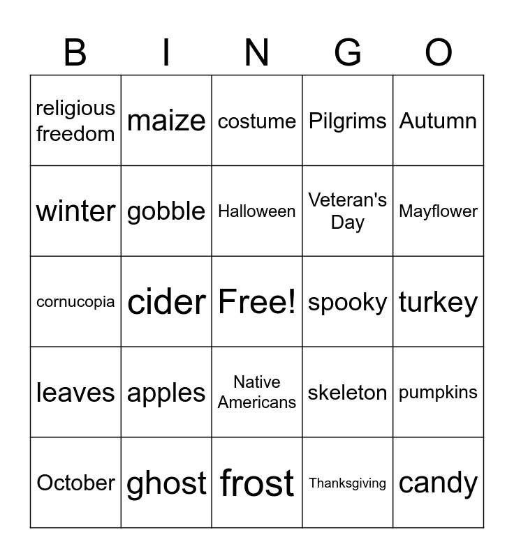 This bingo card has a free space and 29 words: October, November, cider, orange and black, religious freedom, costume, gobble, apples, spooky, ghost, turkey, candy, frost, Thanksgiving, Mayflower, trick or treat, Native Americans, leaves, Autumn, cornucopia, skeleton, bonfires, Veteran's Day, winter, Pilgrims, maize, pumpkins, Halloween and jack-o-lantern.
