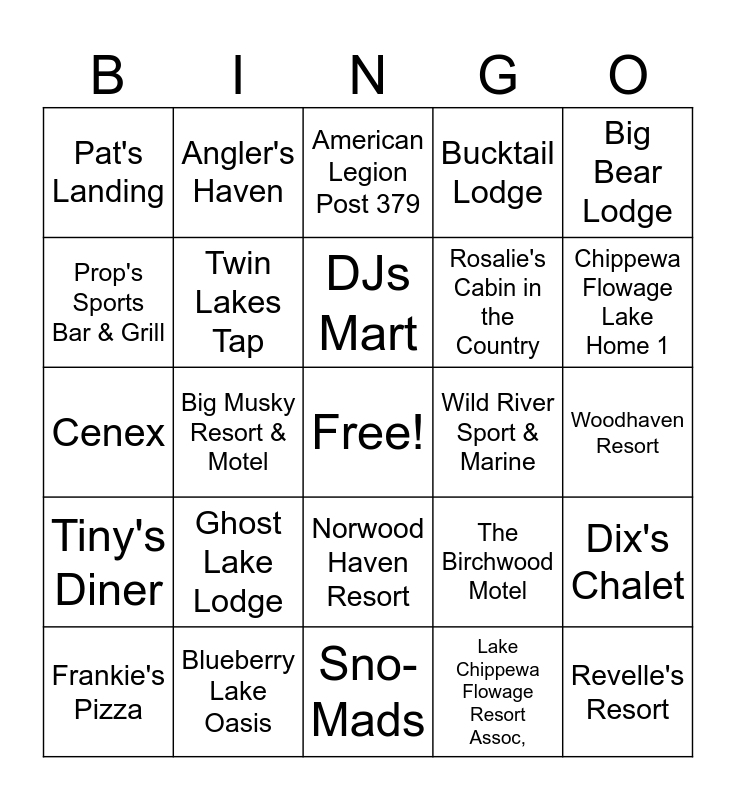 This bingo card has a free space and 164 words: Fish-N-Trap Motel & Campground, The Loretta Steakhouse, Fish Trap Cove, The Rum Shack, Bear Trap, Patko's Stone Lake Pub, Chit Chat Bar, Grill & Resort, Spider Lake Saloon, Sportsman's Lodge Bar & Grill, Lincolnwood Resort, Prop's Sports Bar & Grill, Thomas Marine, American Legion Post 379, Bear Tracks Bar & Grill, The Birchwood Motel, Ed's Pit Stop, Seasonal Power Toys & Bait, Pine Ridge Lodge, The Rockford House, Wagon Wheel, Red Rock Campground & Pub, My Last Resort, Mikana General Store, Cheers Bar & Grill, Full Throttle Sports, Paul's Pizza Den, Long Lake Bait & Tackle & C Store, The Roost, Bairs Edgewater Store, Red Cedar Country Store, Cedar Lake Grill, Bear Paw Resort, Big Bear Lodge, Flambeau Forest Inn, North Country's Hardwood Café, Oxbo Resort, Wolf's Eagle Lodge Resort & Campground, Ransom's Place, Clam Lake Junction, Deer Run Resort, Deerfoot Lodge & Resort, Boulder Lodge on Ghost Lake, Johnson's Resort, Lost Land Lake Lodge, Charlie's Fine Food & Spirits, Wheel Inn, Hayward Power Sports, Props Landing, Grand Pines Resort, R&R Bayview, Lakewoods, Ray Jay's, Treeland Resorts, Angler's Bar & Grill, Sawmill Saloon, Virgin Timber Resort, Red Deer Lodge & Resort, Woodhaven Resort, Riverside Motel, Musky & Sno Country, Lake Chippewa Flowage Resort Assoc,, Louie's Landing Restaurant, Chippewa Flowage Lake Home 1, Tally Ho Supper Club, All Mechanical Services, Ghost Lake Lodge, Park Island Resort, Northwoods Motel, Adventure RV and Powersports, Outdoor Creations Outfitters, Tall Pines Resort, Rosalie's Cabin in the Country, Hayward Veterans Association, Marie's Hideaway Sports Bar & Grill, Red Schoolhouse Wines, Property Management, Uncle Mikes Bar & Grill, C-21 Woods to Water Realty, Northwest Relic Riders, Tamarack Farms Winery, Chippewa Pines Resort, DJs Mart, Summit Lake Game Farm, Riverside Golf & Recreation, Get Hooked, Rock Castle Bar, The Buckhorn, Brenda's Village Café, Dix's Chalet, Tiny's Diner, Four Season's Resort, Runamuk Rides Cable, Reel Livin Resort, Dows Corner, Timber Bay Resort, Pla-Mor, Twin Lakes Tap, Blackiron Bar & Grill, Steudemeyer's Four Seasons Resort, Ammo's Evergreen Tavern, Garmisch USA Resort, Revelle's Resort, Sunset's Bar & Grill, Ramer Small Engine & Powersports, Tavern at White Stag Farm, Flat Creek Inn and Suites, Coop's Pizza, Frankie's Pizza, Cenex, Americinn Hotel & Suites, L&M Fleet, Nelson Lake Landing, Runamuk Rides Hayward, The Lil' Farm Grill, Loon Saloon, Birches, America's Best Value Inn, Holiday Inn Express, Wayside, Ranch Supper Club, Sno-Mads, The Landing, Johnny B's/Blueberry Hill Resort, Blueberry Lake Oasis, Chippewa Inn, The Hutt, Chief Lake Lodge, Pat's Landing, Snowshoe Saloon & Liquor Store, Fish Tales Pub & Grub, Norwood Haven Resort, The Fireside, Price Rite Liquor, Angler's Haven, DJs Mart, Beechmoor, Dewars Black Bear Pub & Grill, Sunset Strip Bar & Gentlemens Club, Brucie's Place, The Boulevard, Trails End Resort, LCO Quick Stop, Kreyer's Candy & Supplies, The Steakhouse & Lodge, Big Fish Golf Club, Big Musky Resort & Motel, Sevenwinds Casino, Rusty Hook Saloon& Smokehouse, Wild River Sport & Marine, DQ Grill & Chill, Sno-Trails Snowmobile Club, Lake Chippewa Flowage Resort Assoc,, Sisko's Pine Point Resort, Bottom's Up, Winter Co-op, Bucktail Lodge, Patty's on 70, Ojibwa Service II, The Rustic Lodge, Phillips 66 Food Mart, Musky Tail Resort, Wannigan, Helsing's Bar and Winter Huskies Snowmobile Club.