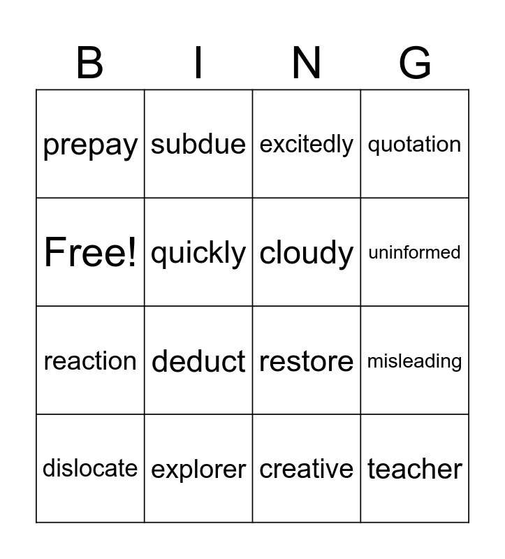 This bingo card has 16 words: explorer, misleading, excitedly, prepay, reaction, subdue, restore, creative, Free!, quickly, dislocate, quotation, deduct, uninformed, cloudy and teacher.