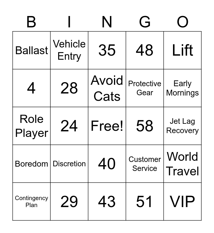 This bingo card has a free space and 158 words: 1, 16, 31, 46, 61, 2, 17, 32, 47, 62, 3, 18, 48, 63, 4, 19, 33, 49, 64, 5, 20, 34, 50, 65, 6, 21, 35, 51, 66, 7, 22, 36, 52, 67, 8, 23, 37, 53, 68, 9, 24, 38, 54, 69, 10, 25, 39, 55, 70, 11, 26, 40, 56, 71, 12, 27, 41, 57, 72, 13, 28, 42, 58, 73, 14, 29, 43, 59, 74, 15, 30, 44, 60, 75, 45, CPR Training, Uniform, Goodyear, Babysitting, Customer Service, Teamwork, Communication, Safety Protocols, Air Travel, Luxury, Security, Precision, World Travel, Blimp, Attention to Detail, Responsibility, Patience, Early Mornings, Calm Under Pressure, Jet Lag, Professionalism, Media Jobs, Helicopter, Confidence, Protective Gear, Travel, Clean Hands, Organization, Safety First, Nanny School, Long Hours, Aviation, First Aid, Discretion, Calm Voice, Hand Model, Childcare, Jet Lag Recovery, Travel Schedule, Hospitality, First Class, Serving Meals, Wine Pairing, Dietary Restrictions, Makeup Standards, Nail Care, Language Skills, Customer Preferences, Boarding Pass, Boarding Check, Flight Deck, Gondola, Lift, Thrust, Engines, Ballast, Airship, Landing Gear, Parking Spot, Visibility, Role Player, Executive Protection, VIP, Diamond Formation, Advance Site Visit, Contingency Plan, Threat Assessment, Security Team, Vehicle Entry, Exit Strategy, Observation, Stealth, Surveillance, Weapons Drill, Realistic Scenario, Boredom, Vigilance, Manicure, Moisturizer, SPF, Concealer, Avoid Cats and Gloves.