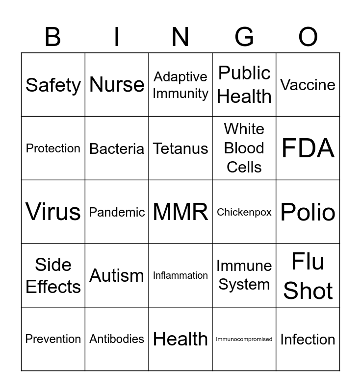 This bingo card has 32 words: Immunocompromised, CDC, Pandemic, Research, Side Effects, Bacteria, Vaccine, Flu Shot, Nurse, Infection, Tetanus, Adaptive Immunity, Innate Immunity, Trust, Chickenpox, Booster, Prevention, Virus, Inflammation, Autism, Immune System, Attenuated, Polio, Antibodies, MMR, Public Health, White Blood Cells, Protection, Safety, Health, HPV and FDA.