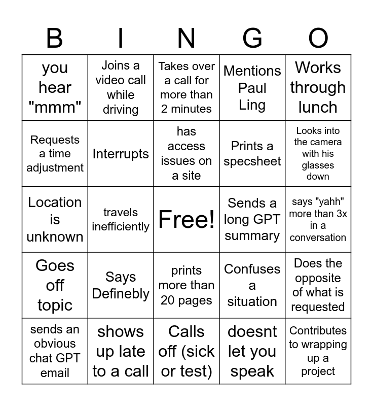 This bingo card has a free space and 24 words: Says Definebly, shows up late to a call, has access issues on a site, sends an obvious chat GPT email, Works through lunch, you hear "mmm", Requests a time adjustment, Joins a video call while driving, Sends a long GPT summary, prints more than 20 pages, Prints a specsheet, Location is unknown, Confuses a situation, Does the opposite of what is requested, Interrupts, doesnt let you speak, says "yahh" more than 3x in a conversation, Takes over a call for more than 2 minutes, Looks into the camera with his glasses down, travels inefficiently, Contributes to wrapping up a project, Goes off topic, Mentions Paul Ling and Calls off (sick or test).