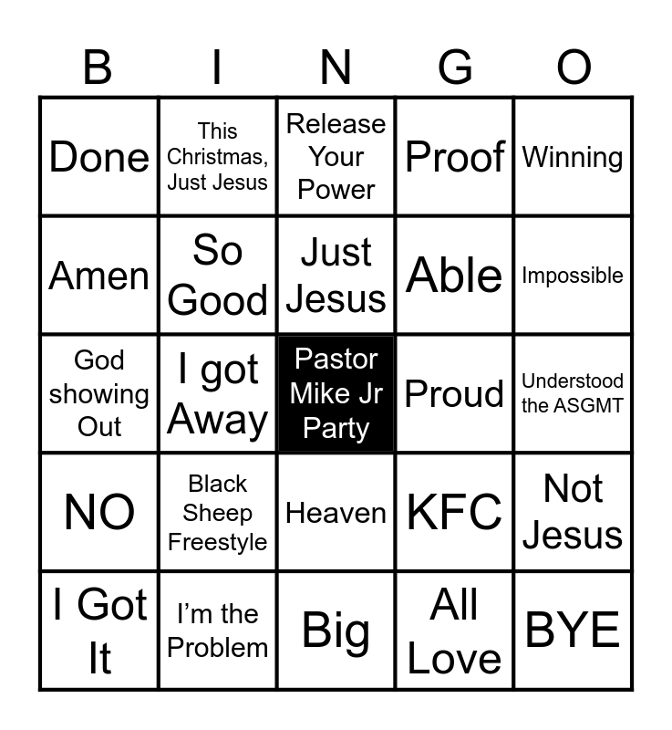 This bingo card has a free space and 51 words: HAHA, BYE, Grateful, Big, Black Sheep Freestyle, No Lie, This Christmas, Just Jesus, Turn It Around, Amen, Pray, So Good, Proof, Not Jesus, KFC, I got away, Break, Just Jesus, Proud, He So, Winning, I got Away, All Love, Done, Able, Love Letter, Achoo, Impossible, Blessed, I Got It, Release Your Power, Counting My Blessing, Mr McClure, of Me, Amazing Testimony, He Came Through, I’m the Problem, He Got Me, What’s a Ninja, Amazing, One Prayer, Understood the ASGMT, NO, Let Me Go, Never Leave, Ninja, Still Here, God showing Out, Release Your Power, Take the City Back, Heaven and Windows.