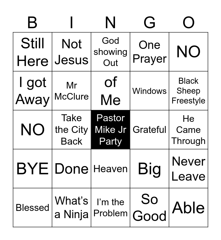 This bingo card has a free space and 69 words: Amazing Testimony, He Came Through, I’m the Problem, He Got Me, What’s a Ninja, Amazing, One Prayer, Understood the ASGMT, NO, Let Me Go, Never Leave, Ninja, Still Here, God showing Out, Release Your Power, Take the City Back, Heaven, Windows, HAHA, BYE, Grateful, Big, Black Sheep Freestyle, No Lie, This Christmas, Just Jesus, Turn It Around, Amen, Pray, So Good, Proof, Not Jesus, KFC, I got away, Break, Just Jesus, Proud, He So, Winning, I got Away, All Love, Done, Able, Love Letter, Achoo, Impossible, Blessed, I Got It, Release Your Power, Counting My Blessing, Mr McClure, of Me, Amazing Testimony, He Came Through, I’m the Problem, He Got Me, What’s a Ninja, Amazing, One Prayer, Understood the ASGMT, NO, Let Me Go, Never Leave, Ninja, Still Here, God showing Out, Release Your Power, Take the City Back, Heaven and Windows.