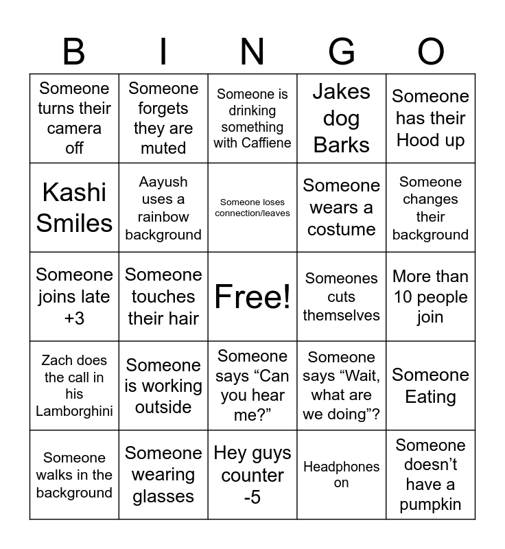 This bingo card has a free space and 30 words: Pet showing up on screen, Someone wearing glasses, Someone is drinking something with Caffiene, Someone Sneezes, Someone has their Hood up, Someone turns their camera off, Aayush uses a rainbow background, Someone loses connection/leaves, Someone wears a costume, Someone doesn’t have a pumpkin, Someone walks in the background, Someone is working outside, Headphones on, Alfie makes a dumb joke, Zach does the call in his Lamborghini, Madina and Yousra have their own conversion, Hey guys counter -5, Someones cuts themselves, Someone Eating, Kashi Smiles, Someone touches their hair, Someone laughs, Jakes dog Barks, More than 10 people join, Someone joins late +3, Someone forgets they are muted, Someone says “Can you hear me?”, Someone says “Wait, what are we doing”?, Someone changes their background and Someone mentions “Slack”.