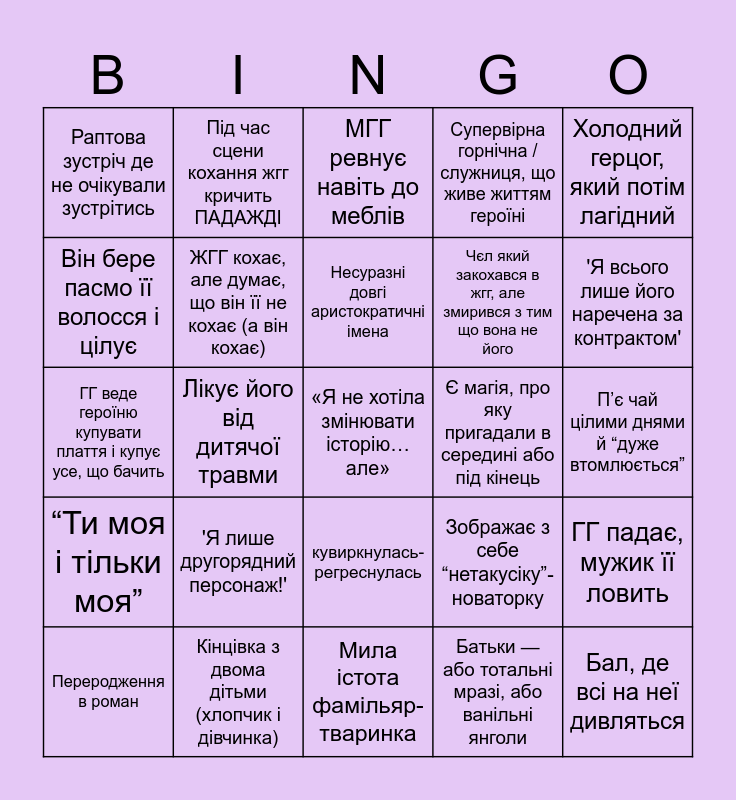 This bingo card has a free space and 24 words: 'Я лише другорядний персонаж!', Кінцівка з двома дітьми (хлопчик і дівчинка), Несуразні довгі аристократичні імена, Переродження в роман, Холодний герцог, який потім лагідний, Раптова зустріч де не очікували зустрітись, Він бере пасмо її волосся і цілує, Під час сцени кохання жгг кричить ПАДАЖДІ, Є магія, про яку пригадали в середині або під кінець, кувиркнулась-регреснулась, Чєл який закохався в жгг, але змирився з тим що вона не його, ГГ веде героїню купувати плаття і купує усе, що бачить, Зображає з себе “нетакусіку”-новаторку, ГГ падає, мужик її ловить, ЖГГ кохає, але думає, що він її не кохає (а він кохає), Батьки — або тотальні мразі, або ванільні янголи, П’є чай цілими днями й “дуже втомлюється”, МГГ ревнує навіть до меблів, 'Я всього лише його наречена за контрактом', Лікує його від дитячої травми, Бал, де всі на неї дивляться, “Ти моя і тільки моя”, Супервірна горнічна / служниця, що живе життям героїні and Мила істота фамільяр-тваринка.