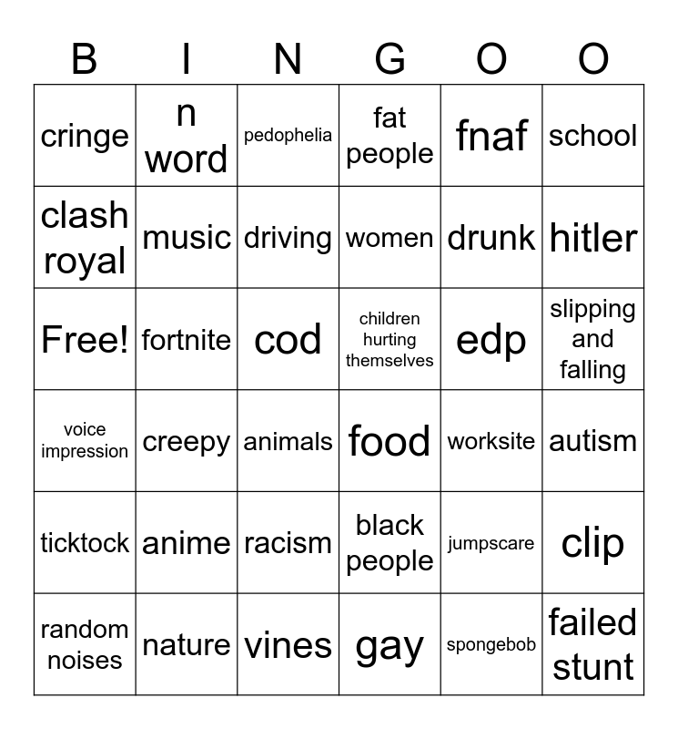 This bingo card has 36 words: black people, racism, gay, clash royal, voice impression, children hurting themselves, music, vines, fnaf, jumpscare, hitler, fat people, clip, fortnite, women, cringe, ticktock, edp, Free!, pedophelia, cod, creepy, food, animals, worksite, n word, drunk, nature, driving, school, failed stunt, random noises, autism, slipping and falling, anime and spongebob.