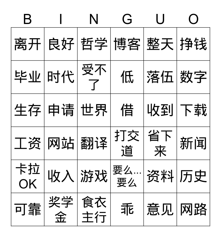 This bingo card has 36 words: 要么... 要么, 游戏, 乖, 毕业, 工资, 借, 时代, 食衣主行, 整天, 资料, 数字, 博客, 历史, 申请, 低, 离开, 卡拉OK, 收到, 生存, 哲学, 世界, 网站, 打交道, 翻译, 省下来, 良好, 落伍, 奖学金, 受不了, 挣钱, 网路, 可靠, 新闻, 下载, 收入 and 意见.