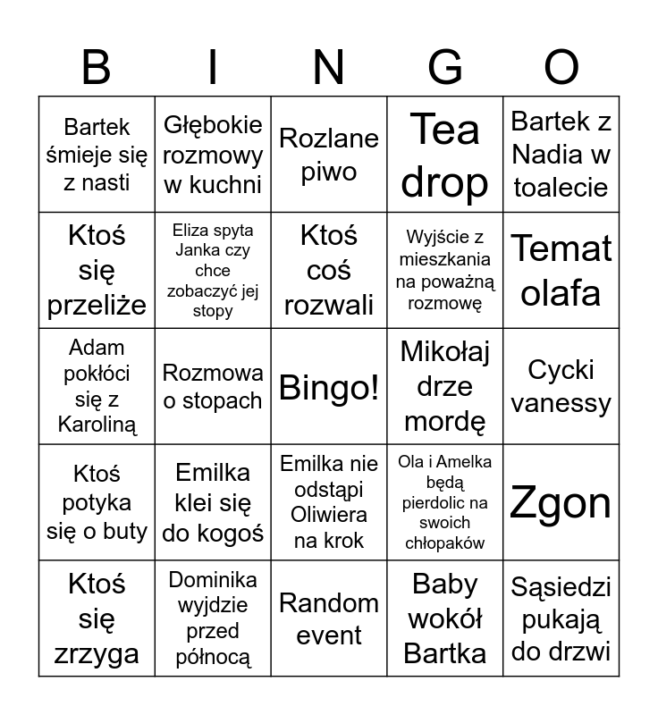 This bingo card has a free space and 24 words: Emilka klei się do kogoś, Dominika wyjdzie przed północą, Ktoś coś rozwali, Ktoś się zrzyga, Bartek z Nadia w toalecie, Bartek śmieje się z nasti, Ktoś się przeliże, Głębokie rozmowy w kuchni, Mikołaj drze mordę, Emilka nie odstąpi Oliwiera na krok, Wyjście z mieszkania na poważną rozmowę, Adam pokłóci się z Karoliną, Ola i Amelka będą pierdolic na swoich chłopaków, Zgon, Eliza spyta Janka czy chce zobaczyć jej stopy, Baby wokół Bartka, Cycki vanessy, Rozlane piwo, Temat olafa, Rozmowa o stopach, Sąsiedzi pukają do drzwi, Ktoś potyka się o buty, Tea drop and Random event.