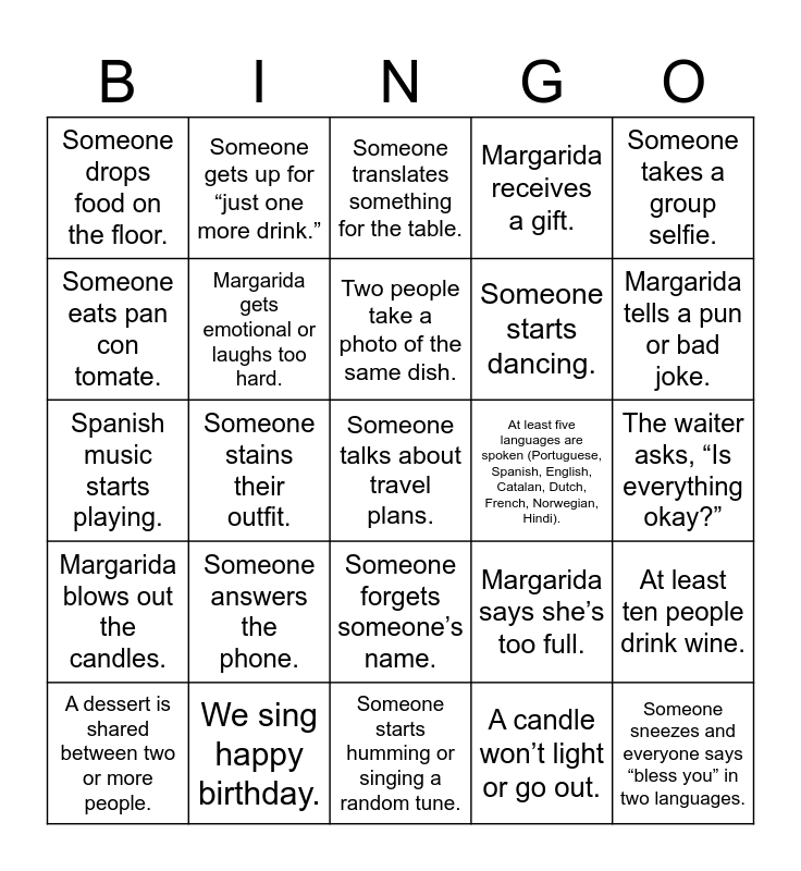 This bingo card has 59 words: Free!, We sing happy birthday., We eat cake., Margarida blows out the candles., A candle won’t light or go out., Margarida forgets to make a wish., Margarida gets emotional or laughs too hard., Someone makes a toast., Someone starts dancing., Margarida gives a speech to everyone., Margarida receives a gift., Everyone starts clapping., Someone eats pan con tomate., Someone joins late., Someone spills a drink or drops a fork., Someone drops food on the floor., Someone talks about travel plans., Someone takes a group selfie., Someone asks the waiter for a photo., Two people take a photo of the same dish., At least five languages are spoken (Portuguese, Spanish, English, Catalan, Dutch, French, Norwegian, Hindi)., Someone translates something for the table., A dessert is shared between two or more people., At least ten people drink wine., Someone says “Cheers!” in another language., A random person in the restaurant wishes Margarida happy birthday., A stranger sings along to the happy birthday song., A debate starts over something completely random., Margarida tells a pun or bad joke., Margarida spills a drink., Margarida gets tipsy., Someone forgets what they were saying halfway through., Someone gives a genuine compliment about Margarida’s outfit., Someone brings up Keenfolks trauma., Someone gets up for “just one more drink.”, Someone knocks over a glass., It starts raining., Someone stains their outfit., Live music starts playing., Spanish music starts playing., A glass breaks (different from just being knocked)., Someone answers the phone., The waiter asks, “Is everything okay?”, An unexpected song everyone knows starts playing., The waiter sings happy birthday (with or without being asked)., Someone makes a video of the event., Someone’s phone runs out of battery., Margarida compliments the food’s presentation., Someone forgets someone’s name., Someone starts humming or singing a random tune., Margarida stumbles., Margarida drinks natural wine., Maggie hugs Chico <3, Someone compliments the food., Someone mentions a past funny story with Margarida., Margarida says she’s too full., We do a group hug., Someone sneezes and everyone says “bless you” in two languages. and Someone brings up exes or old relationships..