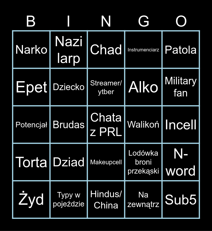 This bingo card has 25 words: Dziad, Hindus/ China, Streamer/ ytber, Żyd, Patola, Narko, Epet, Nazi larp, Walikoń, Makeupcell, Alko, Potencjał, Lodówka broni przekąski, N-word, Dziecko, Sub5, Incell, Chad, Military fan, Brudas, Chata z PRL, Typy w pojeździe, Torta, Instrumenciarz and Na zewnątrz.
