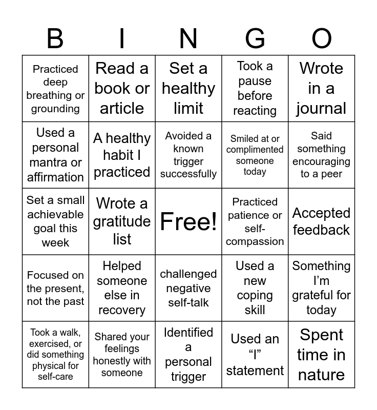 This bingo card has a free space and 24 words: Helped someone else in recovery, Shared your feelings honestly with someone, Avoided a known trigger successfully, Took a walk, exercised, or did something physical for self-care, Wrote in a journal, Practiced deep breathing or grounding, Used a personal mantra or affirmation, Read a book or article, Practiced patience or self-compassion, challenged negative self-talk, Smiled at or complimented someone today, Set a small achievable goal this week, Used a new coping skill, Something I’m grateful for today, A healthy habit I practiced, Used an “I” statement, Accepted feedback, Set a healthy limit, Said something encouraging to a peer, Wrote a gratitude list, Spent time in nature, Focused on the present, not the past, Took a pause before reacting and Identified a personal trigger.