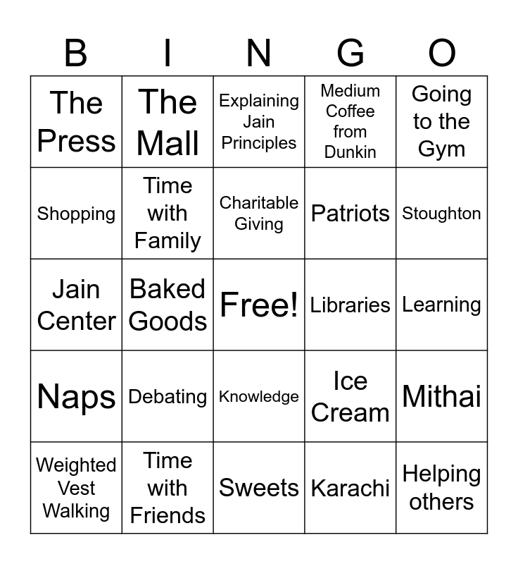This bingo card has a free space and 41 words: Desserts, Jain Center, Listening to Lectures, Time with Family, Time with Friends, Knowledge, Charitable Giving, Grandkids, Going to the Gym, Naps, Baked Goods, Medium Coffee from Dunkin, Helping others, Learning, Libraries, Debating, Dhira, The Press, Cinnamon Bagel from Dunkin, Explaining Jain Principles, Mithai, Fruits, Sweets, Patriots, Religious stories, Dunkin Donuts, Karachi, Coffee Shops, Stoughton, Supporting Education, Story Telling, The Mall, Weighted Vest Walking, Donating, Ice Cream, Shopping, Chai, Going for a Walk, Engineering, Pav Bhaiji BBQ and Matunga.