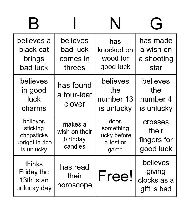 This bingo card has 17 words: Free!, thinks Friday the 13th is an unlucky day, has knocked on wood for good luck, believes a black cat brings bad luck, makes a wish on their birthday candles, has made a wish on a shooting star, crosses their fingers for good luck, believes the number 13 is unlucky, believes the number 4 is unlucky, has found a four-leaf clover, has read their horoscope, does something lucky before a test or game, believes in good luck charms, believes bad luck comes in threes, believes sticking chopsticks upright in rice is unlucky, thinks writing someone's name in red ink is unlucky and believes giving clocks as a gift is bad.
