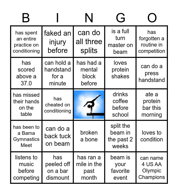 This bingo card has a free space and 24 words: can do a back tuck on beam, has peeled off on a bar dismount, has had a mental block before, listens to music before competing, has forgotten a routine in competition, has spent an entire practice on conditioning, has scored above a 37.0, faked an injury before, drinks coffee before school, broken a bone, loves protein shakes, has missed their hands on the table, split the beam in the past 2 weeks, loves to condition, can hold a handstand for a minute, beam is your favorite event, ate a protein bar this morning, can do all three splits, can do a press handstand, has cheated on conditioning, can name 4 US AA Olympic Champions, has been to a Bama Gymnastics Meet, is a full turn master on beam and has ran a mile in the past month.