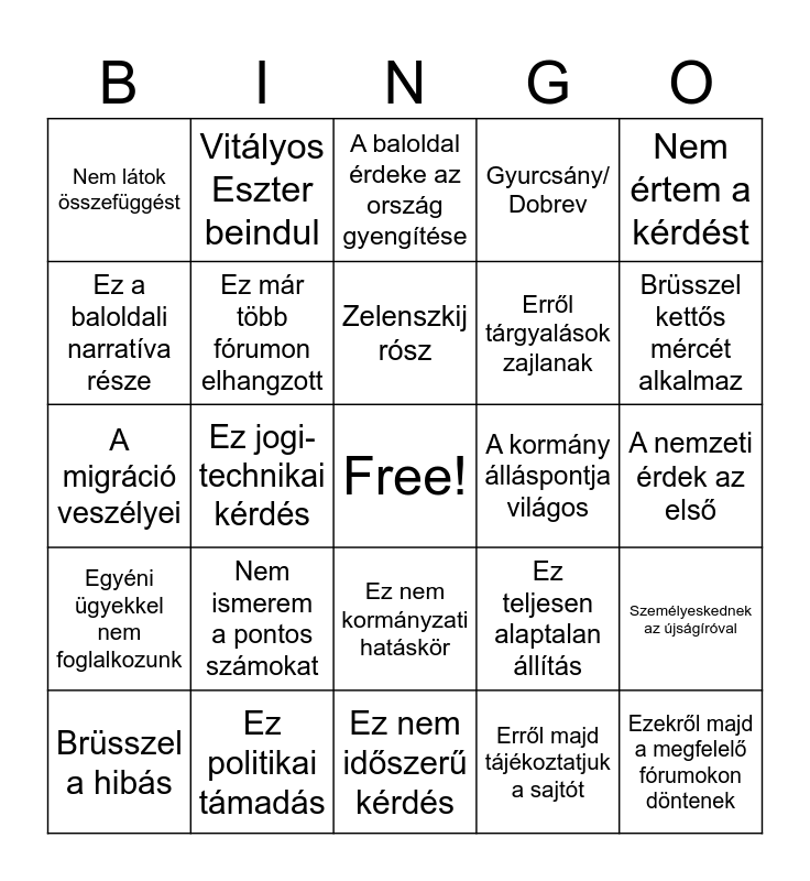 This bingo card has a free space and 29 words: Brüsszel a hibás, A magyar emberek világosan döntöttek, Ez jogi-technikai kérdés, Erről majd a miniszterelnök dönt, Nem látok összefüggést, A baloldal érdeke az ország gyengítése, Ez már több fórumon elhangzott, Nem ismerem a pontos számokat, A kormány álláspontja világos, Ez politikai támadás, A nemzeti érdek az első, Ezekről majd a megfelelő fórumokon döntenek, Ez nem időszerű kérdés, Erről majd tájékoztatjuk a sajtót, Brüsszel kettős mércét alkalmaz, A magyar gazdaság erős, Ez nem kormányzati hatáskör, Egyéni ügyekkel nem foglalkozunk, Nem értem a kérdést, A migráció veszélyei, Ez teljesen alaptalan állítás, Minden adat nyilvános, Erről tárgyalások zajlanak, Ez a baloldali narratíva része, Gyurcsány/ Dobrev, Vitályos Eszter beindul, Személyeskednek az újságíróval, Zelenszkij rósz and Hatvanpuszta lyó.