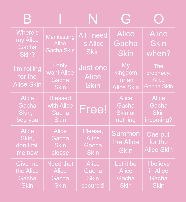 This bingo card has a free space and 24 words: Alice Gacha Skin please, Need that Alice Gacha Skin, Just one Alice Skin, Give me the Alice Gacha Skin, Alice Skin when?, Where’s my Alice Gacha Skin?, I’m rolling for the Alice Skin, Manifesting Alice Gacha Skin, Alice Gacha Skin or nothing, Please, Alice Gacha Skin, My kingdom for an Alice Skin, Alice Gacha Skin, I beg you, Summon the Alice Skin, One pull for the Alice Skin, I only want Alice Gacha Skin, Let it be Alice Gacha Skin, Alice Gacha Skin incoming?, All I need is Alice Skin, The prophecy: Alice Gacha Skin, Blessed with Alice Gacha Skin, I believe in Alice Gacha Skin, Alice Skin, don’t fail me now, Alice Gacha Skin and Alice Gacha Skin secured!.