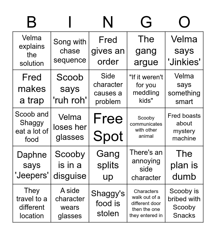 This bingo card has a free space and 33 words: Shaggy says ‘Zoinks’, Treasure is found, Velma loses her glasses, Someone has a foriegn accent, Daphne says 'Jeepers', Scoob says 'ruh roh', Velma says 'Jinkies', They travel to a different location, Song with chase sequence, Someone has a secret, Side character causes a problem, Fred gives an order, Police/sheriff tells them off, Fred calls them a gang, Scooby communicates with other animal, Velma says something smart, A side character wears glasses, Scoob and Shaggy eat a lot of food, Scooby is in a disguise, There's an annoying side character, Gang splits up, Shaggy is afraid, Velma explains the solution, Fred boasts about mystery machine, Shaggy's food is stolen, Scooby is bribed with Scooby Snacks, The gang argue, "If it weren't for you meddling kids", Fred makes a trap, The plan is dumb, Suddenly it's the 1970s, Characters walk out of a different door then the one they entered in and Side character has an accent.