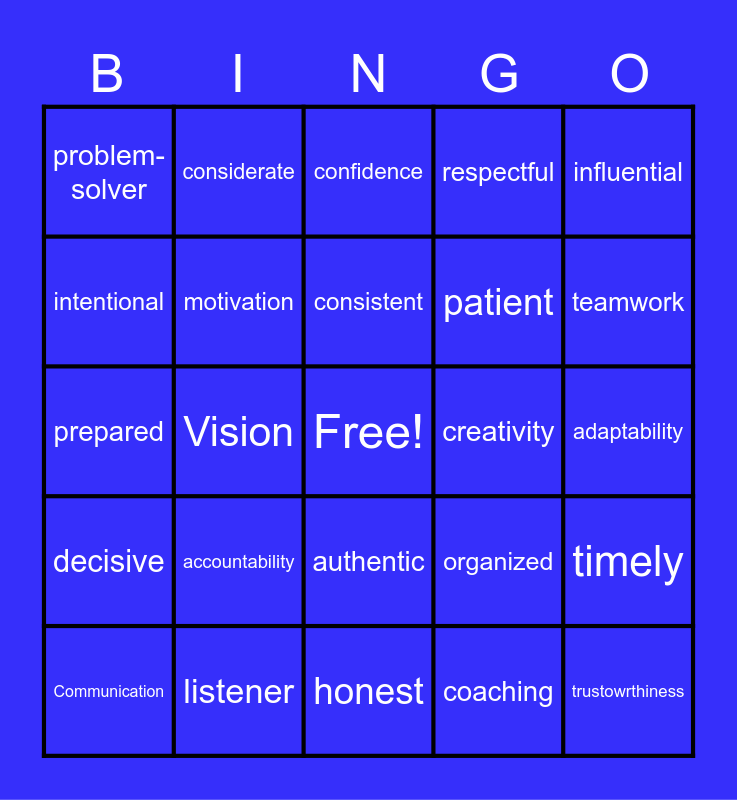 This bingo card has a free space and 29 words: Communication, Integrity, Vision, Empathy, problem-solver, confidence, motivation, accountability, creativity, listener, adaptability, trustowrthiness, honest, coaching, teamwork, reliable, authentic, decisive, influential, prepared, organized, persistent, patient, intentional, respectful, considerate, timely, consistent and forgiving.