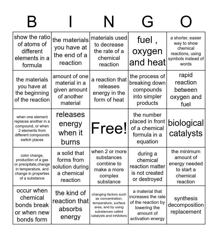 This bingo card has a free space and 24 words: a solid that forms from solution during a chemical reaction, the kind of reaction that absorbs energy, a reaction that releases energy in the form of heat, occur when chemical bonds break or when new bonds form, a shorter, easier way to show chemical reactions, using symbols instead of words, show the ratio of atoms of different elements in a formula, the materials you have at the beginning of the reaction, the materials you have at the end of a reaction, the number placed in front of a chemical formula in a equation, when 2 or more substances combine to make a more complex substance, the process of breaking down compounds into simpler products, when one element replaces another in a compound, or when 2 elements from different compounds switch places, during a chemical reaction matter is not created or destroyed, the minimum amount of energy needed to start a chemical reaction, amount of one material in a given amount of another material, a material that increases the rate of the reaction by lowering the amount of activation energy, biological catalysts, materials used to decrease the rate of a chemical reaction, rapid reaction between oxygen and fuel, releases energy when it burns, synthesis decomposition replacement, color change, production of a gas or precipitate,change in temperature, and change in properties of a substance, fuel , oxygen and heat and changing factors such as concentration, temperature, surface area, and by using substances called catalysts and inhibitors.