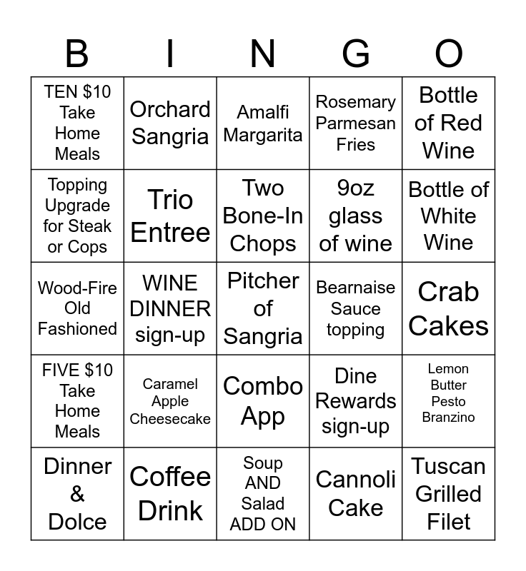 This bingo card has 25 words: Caramel Apple Cheesecake, Soup AND Salad ADD ON, Two Bone-In Chops, Dinner & Dolce, Bottle of Red Wine, TEN $10 Take Home Meals, Topping Upgrade for Steak or Cops, Orchard Sangria, Bearnaise Sauce topping, Combo App, 9oz glass of wine, Wood-Fire Old Fashioned, Dine Rewards sign-up, Lemon Butter Pesto Branzino, Trio Entree, Tuscan Grilled Filet, Crab Cakes, Amalfi Margarita, Bottle of White Wine, WINE DINNER sign-up, Pitcher of Sangria, Coffee Drink, FIVE $10 Take Home Meals, Rosemary Parmesan Fries and Cannoli Cake.