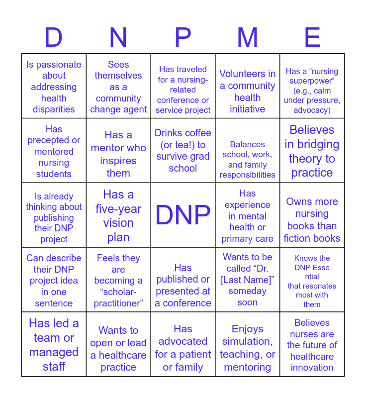 This bingo card has a free space and 24 words: Feels they are becoming a “scholar-practitioner”, Wants to open or lead a healthcare practice, Drinks coffee (or tea!) to survive grad school, Has led a team or managed staff, Has a “nursing superpower” (e.g., calm under pressure, advocacy), Is passionate about addressing health disparities, Has precepted or mentored nursing students, Sees themselves as a community change agent, Has experience in mental health or primary care, Has published or presented at a conference, Balances school, work, and family responsibilities, Is already thinking about publishing their DNP project, Wants to be called “Dr. [Last Name]” someday soon, Knows the DNP Essential that resonates most with them, Has a mentor who inspires them, Enjoys simulation, teaching, or mentoring, Owns more nursing books than fiction books, Has traveled for a nursing-related conference or service project, Believes in bridging theory to practice, Has a five-year vision plan, Believes nurses are the future of healthcare innovation, Can describe their DNP project idea in one sentence, Volunteers in a community health initiative and Has advocated for a patient or family.