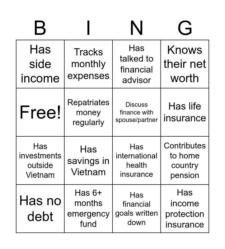This bingo card has 16 words: Has 6+ months emergency fund, Contributes to home country pension, Has talked to financial advisor, Has side income, Has investments outside Vietnam, Tracks monthly expenses, Has international health insurance, Has financial goals written down, Free!, Repatriates money regularly, Has no debt, Knows their net worth, Has savings in Vietnam, Has life insurance, Discuss finance with spouse/partner and Has income protection insurance.