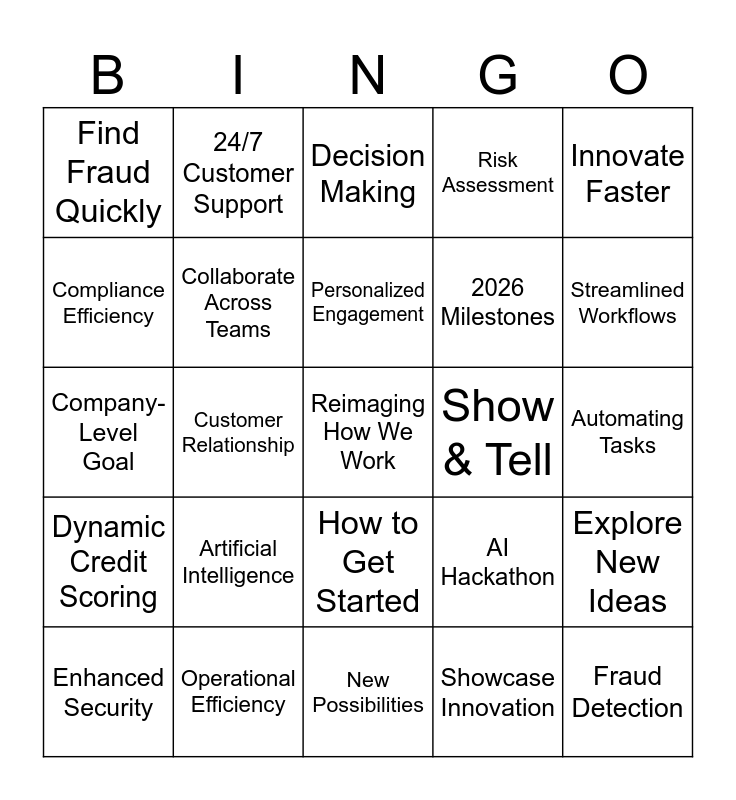 This bingo card has a free space and 24 words: Artificial Intelligence, Operational Efficiency, Personalized Engagement, Enhanced Security, Innovate Faster, Find Fraud Quickly, Compliance Efficiency, 24/7 Customer Support, Show & Tell, How to Get Started, 2026 Milestones, Company-Level Goal, AI Hackathon, Explore New Ideas, Collaborate Across Teams, Showcase Innovation, Automating Tasks, Decision Making, Streamlined Workflows, Customer Relationship, Fraud Detection, Dynamic Credit Scoring, Risk Assessment and New Possibilities.