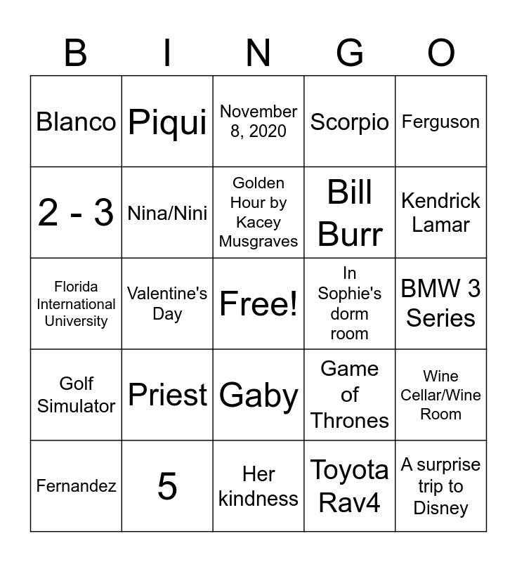 This bingo card has a free space and 75 words: Torres/Cristina’s House, October 31, 2020, November 8, 2020, Holidate, January 5, 2021, November 24, 2024, Monkey Rock in Lake Tahoe, January 24, 2026, November 8, 2025, Luca Osteria, Going to a comedy show, Play with Theo and look at houses, Golden Hour by Kacey Musgraves, 2 - 3, A safari in South Africa, or Japan, Valentine's Day, A fancy chess set, A surprise trip to Disney, Lourdes, Ferguson, University of Miami, Florida International University, Nina/Nini, Piqui, Scorpio, Gemini, Theo, Ausiedoodle, Cardiology, Swimming, When Harry Met Sally, Pulp Fiction, The Real Housewives of Miami, Game of Thrones, Kendrick Lamar, Bill Burr, Isabelle, Alejandro, BMW 3 Series, Toyota Rav4, History, Biology, Fourth of July, Christmas, Torres, Picon, Fernandez, Blanco, Juggling, 8, Sophie, Gaby, Neil, Sales Associate at Anthropologie, Medical Assistant, Doya, Cote, cristinaishungry, Argentina, Doctor, Priest, Baby Jane, November 7, 1998, May 27, 1999, Roast chicken and orzo, In Sophie's dorm room, 11, Alex Cordobes cheesecakes, Miami Hurricanes, Wine Cellar/Wine Room, Golf Simulator, 5, Bodega, Her kindness and His dedication to his career and loved ones.