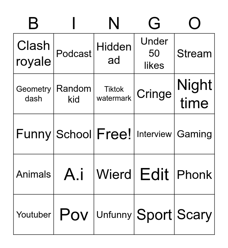 This bingo card has a free space and 24 words: A.i, Pov, Tiktok watermark, Youtuber, Stream, Clash royale, Geometry dash, Podcast, Interview, Wierd, Cringe, Funny, Edit, Phonk, Random kid, Sport, Gaming, Hidden ad, Night time, School, Scary, Animals, Under 50 likes and Unfunny.
