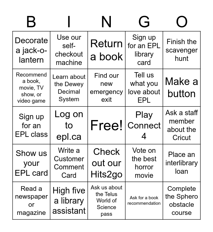 This bingo card has a free space and 26 words: Check out our Hits2go, Ask for a book recommendation, Find our new emergency exit, High five a library assistant, Finish the scavenger hunt, Decorate a jack-o-lantern, Recommend a book, movie, TV show, or video game, Use our self-checkout machine, Ask a staff member about the Cricut, Vote on the best horror movie, Tell us what you love about EPL, Sign up for an EPL class, Place an interlibrary loan, Read a newspaper or magazine, Log on to epl.ca, Use your EPL App, Sign up for an EPL library card, Show us your EPL card, Return a book, Complete the Sphero obstacle course, Make a button, Ask us about the Telus World of Science pass, Play Connect 4, Write a Customer Comment Card, Learn about the Dewey Decimal System and Ask us about the classes we offer.