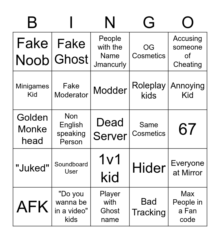 This bingo card has 25 words: Soundboard User, Player with Ghost name, Modder, AFK, Accusing someone of Cheating, Fake Noob, Minigames Kid, Fake Ghost, Same Cosmetics, 1v1 kid, Roleplay kids, Golden Monke head, Hider, Everyone at Mirror, Fake Moderator, Max People in a Fan code, 67, People with the Name Jmancurly, Annoying Kid, Non English speaking Person, Dead Server, "Do you wanna be in a video" kids, "Juked", OG Cosmetics and Bad Tracking.