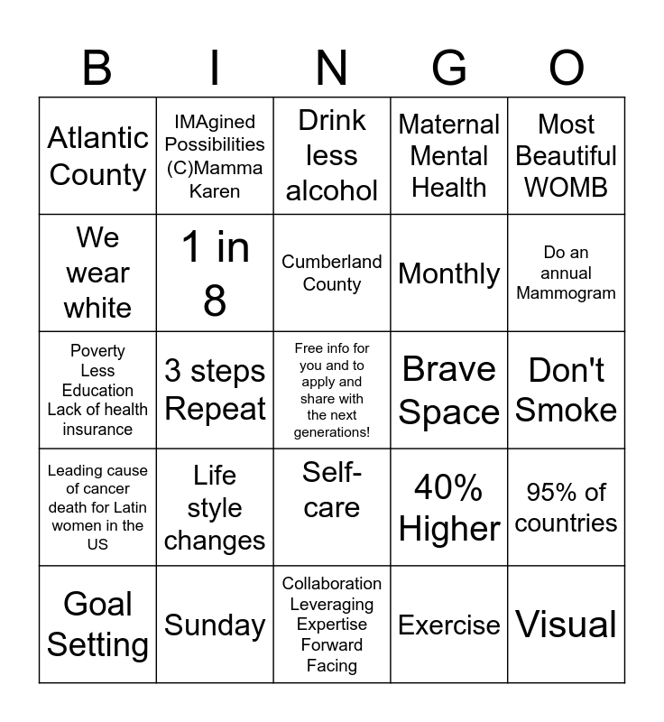 This bingo card has a free space and 24 words: Life style changes, Sunday, Cumberland County, Goal Setting, Most Beautiful WOMB, Atlantic County, We wear white, IMAgined Possibilities (C)Mamma Karen, Brave Space, Self-care, Monthly, Poverty Less Education Lack of health insurance, 40% Higher, 95% of countries, 1 in 8, Exercise, Don't Smoke, Drink less alcohol, Do an annual Mammogram, 3 steps Repeat, Visual, Leading cause of cancer death for Latin women in the US, Maternal Mental Health and Collaboration Leveraging Expertise Forward Facing.