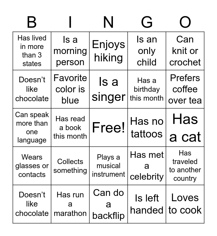 This bingo card has a free space and 24 words: Collects something, Has run a marathon, Is a singer, Doesn’t like chocolate, Can knit or crochet, Has lived in more than 3 states, Doesn’t like chocolate, Is a morning person, Has no tattoos, Plays a musical instrument, Has a birthday this month, Can speak more than one language, Has met a celebrity, Has traveled to another country, Favorite color is blue, Is left handed, Has a cat, Enjoys hiking, Prefers coffee over tea, Has read a book this month, Loves to cook, Wears glasses or contacts, Is an only child and Can do a backflip.