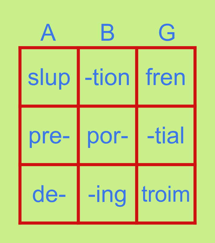 This bingo card has 9 words: de-, fren, -tion, pre-, slup, -tial, por-, troim and -ing.